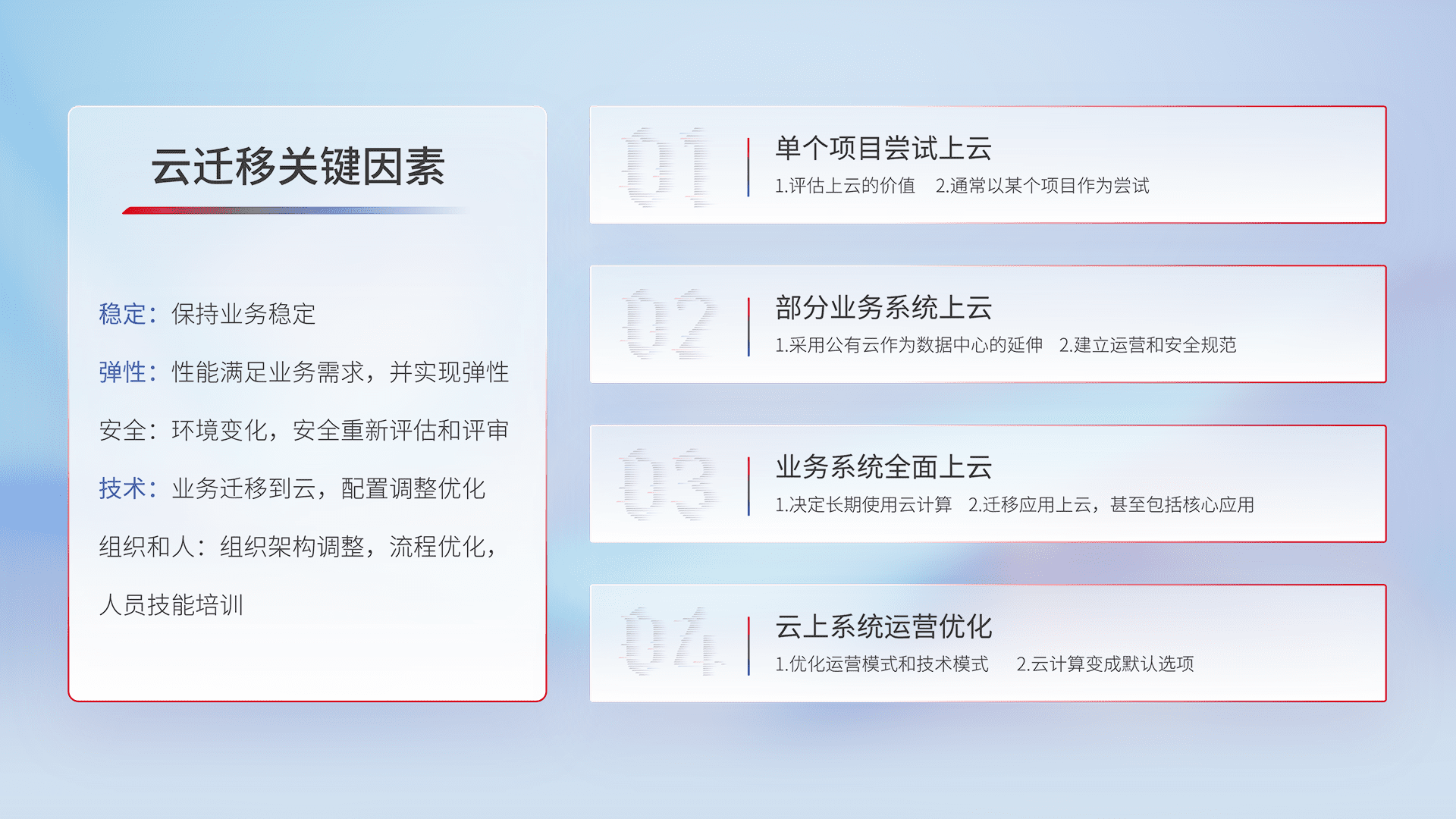 结合实际业务,,从规划设计、、、云平台选型、、、云原生改造、、、、数据迁移、、集成交付,,,迁移全过程为客户识别最佳上云路径,,做好风险识别管理,,,,设计网络架构、、、身份权限、、安全审计合规、、操作审计、、、、日志审计、、监控告警策略、、、、多站点容灾设计等,,,对云上基础设施进行整体规划,,,提升IT治理水平,,,,以满足弹性、、、、高可用、、、高性能的需求。。。