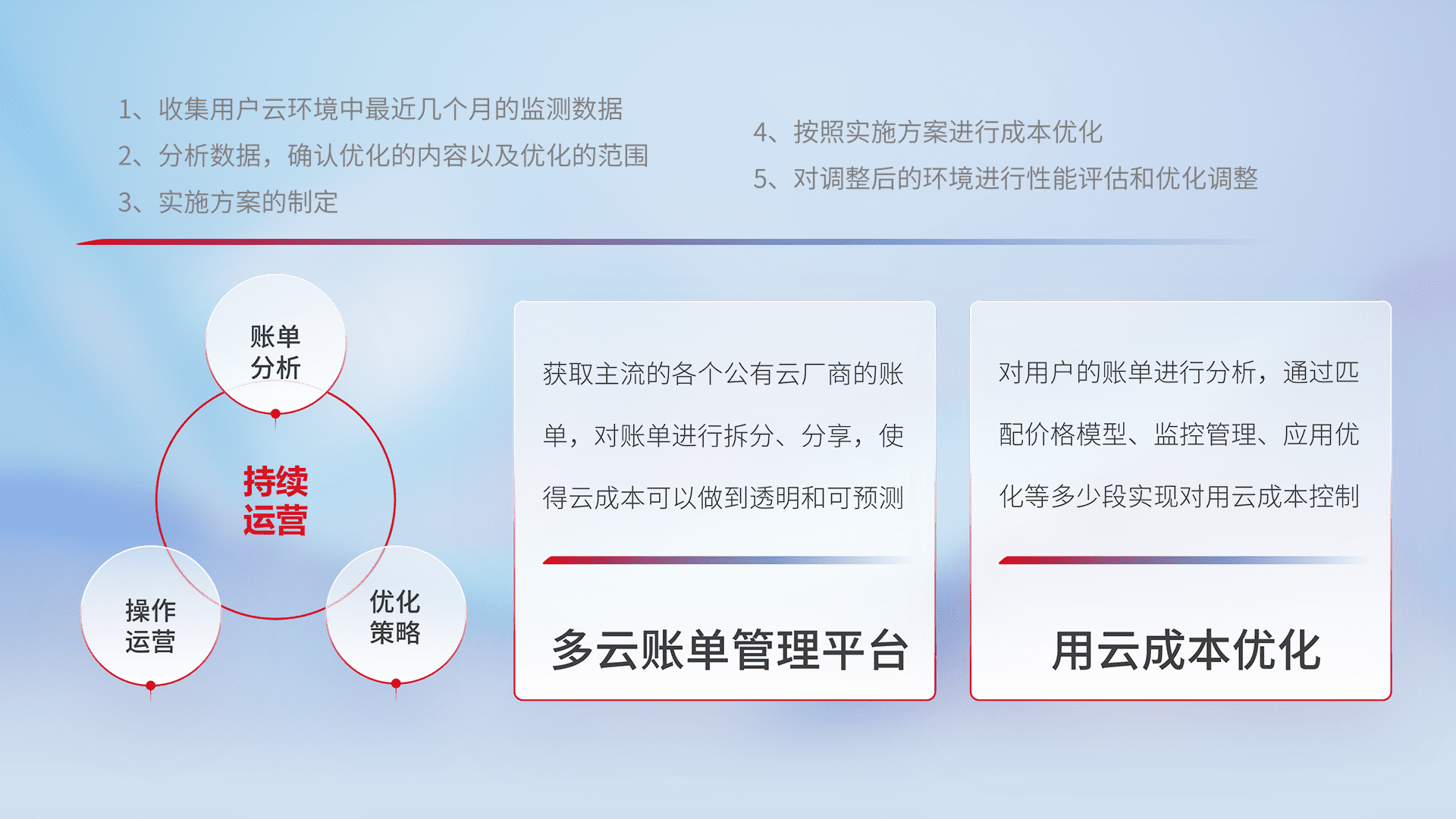 通过多云纳管,,,,以统一的资源数据模型把客户的云资源进行抽象和封装,,进而实现对多云资源的统一操作,,,保障云资源管理的可靠性、、、、稳定性与可用性。。量身定制化运维内容,,配置、、、、开发运维、、、补丁管理、、备份、、、监控、、、认证和访问管理、、、、审计和日常巡检等,,保障在用云过程中的可靠度,,稳定度以及高可用率。。。
